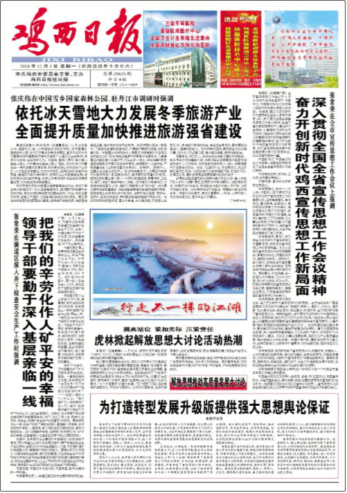 《雞西日?qǐng)?bào)》創(chuàng)刊于1948年11月15日,由雞西新聞傳媒集團(tuán)主辦,對(duì)開(kāi)4版,膠版彩色印刷,日發(fā)行量5萬(wàn)余份。輻射雞西市所轄的市1縣6區(qū)12個(gè)礦。