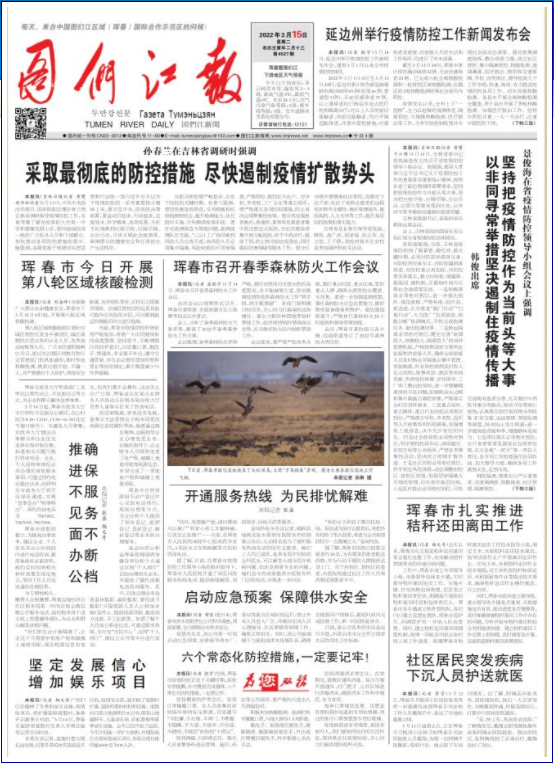 《圖們江報》為對開四版,彩色印刷,每周六刊。全方位報道琿春暨圖們江區(qū)域開放開發(fā)進程,政策走向和經(jīng)貿(mào)信息,為大圖們江區(qū)域的國際交流、合作與開發(fā)服務(wù)。報紙分別在長春南航、延吉國航和南航登上飛機;報紙上了東春航線,發(fā)行到俄羅斯、韓國駐琿春代表處,并交流到俄羅斯、韓國。