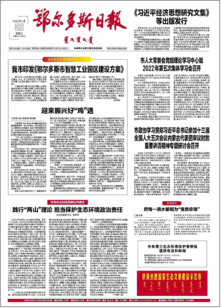 《鄂爾多斯日?qǐng)?bào)》蒙文版,出版量為每周4期對(duì)開4版2期四開4版,版面安排:一版為要聞版,二版為綜合新聞,三版?陌鏋闀r(shí)事新聞,星期六、星期日為?赌撩裰选泛汀缎瞧诳。