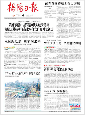 《揭陽日報》是中共揭陽市委機關(guān)報,創(chuàng)刊于1992年4月1日,對開八版,周七刊,是一份由報社自辦發(fā)行的綜合性日報!督谊柸請蟆肥且环萦蓤笊缱赞k發(fā)行的綜合性日報,刊號CN44-0033。