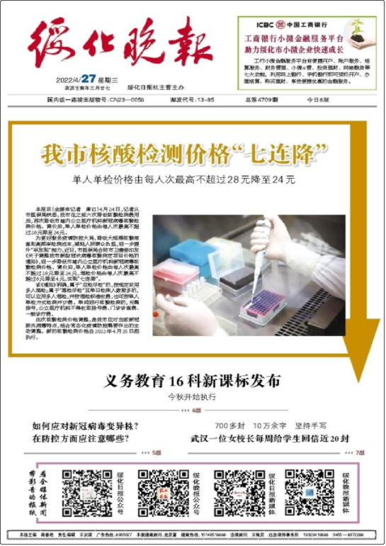 晚報著重于新聞服務(wù)于經(jīng)濟(jì),服務(wù)于生活。我們曾配合哈洽會、慶安綠節(jié)、蘭西亞麻節(jié)等推出10期服務(wù)特刊。每年高考、中考、寒暑假,晚報都推出高考特刊、中考特刊、假日特刊。
