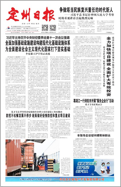 經(jīng)過十年的發(fā)展,《定州日報》由小到大,目前發(fā)展成為全省一流的縣(市)級日報。報社提出了“向人民日報看齊,向全國一流大報看齊,把《定州日報》辦成全國縣級市一流日報”的目標(biāo)。圍繞著這一目標(biāo),《定州日報》堅持高標(biāo)準(zhǔn)、高起點、高發(fā)展,僅去年5月份以來就先后投資近百萬元,加強報社硬件建設(shè),新上激光照排設(shè)備、國內(nèi)最先進(jìn)的排版系統(tǒng)和專業(yè)照相設(shè)備等,使報社實力進(jìn)一步增強。真正融入定州百萬人展的政治生活中,成為人們不可缺少的精神食糧和宣傳群眾、教育群眾、帶領(lǐng)廣大干部群眾團(tuán)結(jié)奮斗、奮勇向前、與時俱進(jìn)的力量源泉和全市百萬人民的良師益友。