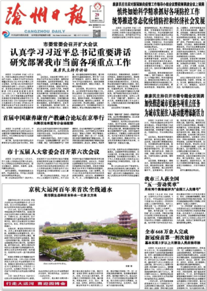 《 滄州日報》是滄州市委機關(guān)報,由滄州市委主管主辦!稖嬷萑請蟆穭(chuàng)刊于1956年7月1日,初始稱作《滄州報》,后改為《渤海日報》,直到《滄州日報》。