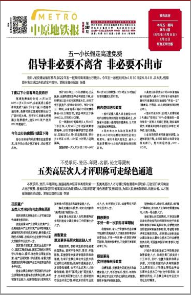 《中原地鐵報》是由鄭州報業(yè)集團主管,鄭州晚報社與鄭州軌道交通有限公司聯(lián)合打造,作為鄭州地鐵唯一免費讀本,創(chuàng)刊時就以時尚、資訊、實用為內(nèi)容定位,將與城市生活息息相關(guān)的各種元素納入其中,秉承“地道生活、快意閱讀”的理念,有趣有味有意思,已經(jīng)成為地鐵內(nèi)最具消費力群里白領(lǐng)一族新聞信息和生活資訊的來源。獨占優(yōu)質(zhì)地鐵媒體渠道,覆蓋鄭州地鐵一號線、二號線,每周四起派發(fā)5天。