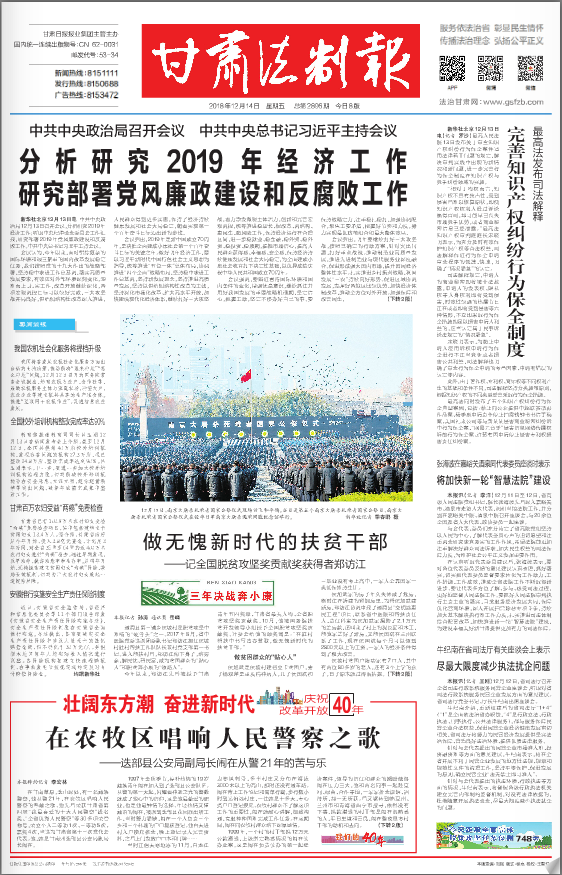 《甘肅法制報》除及時地報道國內(nèi)省內(nèi)重大新聞外,還用較大篇幅介紹精神文明建設(shè)和綜合治理典型及普法動態(tài),通過新鮮、生動、翔實的報道展示普通百姓的文化生活、倫理道德及經(jīng)濟等方面的生活以民事、行政、經(jīng)濟,刑事案例釋法,為廣大群眾學(xué)法用法服務(wù)。