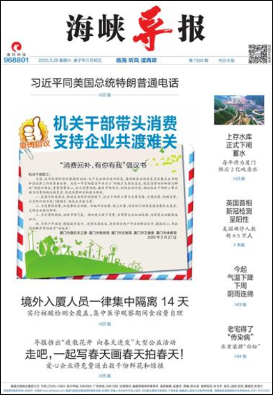 《海峽導(dǎo)報》立足廈門、面向全國,以增進兩岸相互了解、相互交流、共同發(fā)展為宗旨,全方位、多角度地報道海峽兩岸的政治、經(jīng)濟、文化等方面的最新動態(tài),是全國唯一以對臺宣傳為主的綜合性市民生活報。