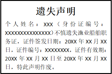 個(gè)人姓名:XXX(身份證編號(hào):XXXXXXXXXXXXXXX)不慎遺失漁業(yè)船舶職務(wù)證,證件簽發(fā)日期:20XX年XX月XX日,證件編號(hào):XXXXXXXX,證件有效期:20XX年XX月XX日至20XX年XX月XX日,特此聲明作廢。