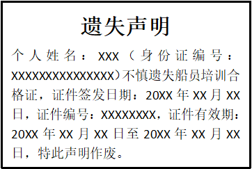 個人姓名:XXX(身份證編號:XXXXXXXXXXXXXXX)不慎遺失船員培訓合格證,證件簽發(fā)日期:20XX年XX月XX日,證件編號:XXXXXXXX,證件有效期:20XX年XX月XX日至20XX年XX月XX日,特此聲明作廢。