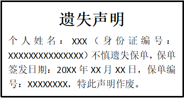 個人姓名:XXX(身份證編號:XXXXXXXXXXXXXXX)不慎遺失保單,保單簽發(fā)日期:20XX年XX月XX日,保單編號:XXXXXXXX,特此聲明作廢。