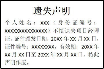 個人姓名:XXX(身份證編號:XXXXXXXXXXXXXXX)不慎遺失項目經(jīng)理證,證件頒發(fā)日期:20XX年XX月XX日,證件編號:XXXXXXXX,有效期:20XX年XX月XX日至20XX年XX月XX日,特此聲明作廢。