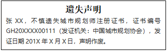張XX,不慎遺失城市規(guī)劃師注冊證書,證書編號GH20XXXX00111(發(fā)證機(jī)關(guān):中國城市規(guī)劃協(xié)會),發(fā)證日期201X年X月X日,聲明作廢。
