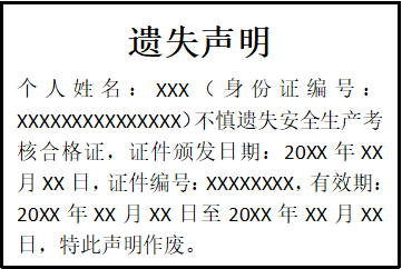 個(gè)人姓名:XXX(身份證編號(hào):XXXXXXXXXXXXXXX)不慎遺失安全生產(chǎn)考核合格證,證件頒發(fā)日期:20XX年XX月XX日,證件編號(hào):XXXXXXXX,有效期:20XX年XX月XX日至20XX年XX月XX日,特此聲明作廢。