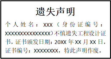 個(gè)人姓名:XXX(身份證編號(hào):XXXXXXXXXXXXXXX)不慎遺失工程設(shè)計(jì)證書,證書頒發(fā)日期:20XX年XX月XX日,證書編號(hào):XXXXXXXX,特此聲明作廢。