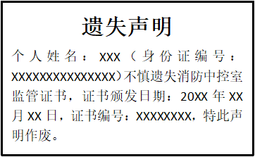 個(gè)人姓名:XXX(身份證編號:XXXXXXXXXXXXXXX)不慎遺失消防中控室監(jiān)管證書,證書頒發(fā)日期:20XX年XX月XX日,證書編號:XXXXXXXX,特此聲明作廢。