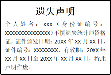 個(gè)人姓名:XXX(身份證編號(hào):XXXXXXXXXXXXXXX)不慎遺失統(tǒng)計(jì)師資格證,證件頒發(fā)日期:20XX年XX月XX日,證件編號(hào):XXXXXXXX,有效期:20XX年XX月XX日至20XX年XX月XX日,特此聲明作廢。