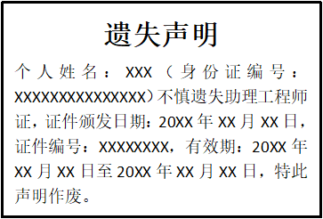 個(gè)人姓名:XXX(身份證編號(hào):XXXXXXXXXXXXXXX)不慎遺失助理工程師證,證件頒發(fā)日期:20XX年XX月XX日,證件編號(hào):XXXXXXXX,有效期:20XX年XX月XX日至20XX年XX月XX日,特此聲明作廢。