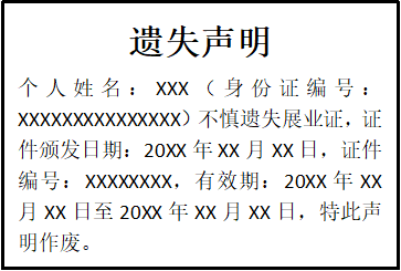 個人姓名:XXX(身份證編號:XXXXXXXXXXXXXXX)不慎遺失展業(yè)證,證件頒發(fā)日期:20XX年XX月XX日,證件編號:XXXXXXXX,有效期:20XX年XX月XX日至20XX年XX月XX日,特此聲明作廢。