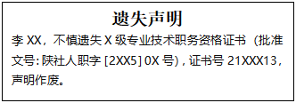 李XX,不慎遺失X級專業(yè)技術(shù)職務資格證書(批準文號:陜社人職字[2XX5]0X號),證書號21XXX13,聲明作廢。