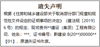 根據(jù)《住房和城鄉(xiāng)建設部關于取消部分部門規(guī)章和規(guī)范性文件設定的證明事項的決定》(建法規(guī)〔2019〕6號)的規(guī)定,現(xiàn)將貴州**建設(集團)工程有限公司,姓名:***、證書編號:黔建安B(20**)00000**【01】,原遺失證書作廢。