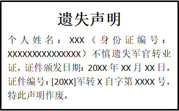 個人姓名:XXX(身份證編號:XXXXXXXXXXXXXXX)不慎遺失軍官轉(zhuǎn)業(yè)證,證件頒發(fā)日期:20XX年XX月XX日,證件編號:[20XX]軍轉(zhuǎn)X自字第XXXX號,特此聲明作廢。
