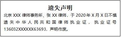 北京XXX律師事務(wù)所、張XX律師,于2020年X月X日不慎遺失中華人民共和國律師執(zhí)業(yè)證,執(zhí)業(yè)證號136032XXXXXX63693,聲明作廢。