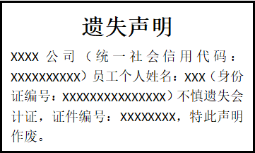 XXXX公司(統(tǒng)一社會信用代碼:XXXXXXXXXX)員工個人姓名:XXX(身份證編號:XXXXXXXXXXXXXXX)不慎遺失會計證,證件編號:XXXXXXXX,特此聲明作廢。