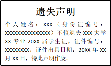 個(gè)人姓名:XXX(身份證編號(hào):XXXXXXXXXXXXXXX)不慎遺失XXX大學(xué)XX專業(yè)20XX屆學(xué)生證,證件編號(hào):XXXXXXXX,證件出具日期:20XX年XX月XX日,特此聲明作廢。