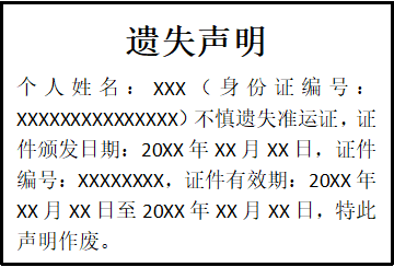 個人姓名:XXX(身份證編號:XXXXXXXXXXXXXXX)不慎遺失準運證,證件頒發(fā)日期:20XX年XX月XX日,證件編號:XXXXXXXX,證件有效期:20XX年XX月XX日至20XX年XX月XX日,特此聲明作廢。