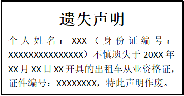 個人姓名:XXX(身份證編號:XXXXXXXXXXXXXXX)不慎遺失于20XX年XX月XX日XX開具的出租車從業(yè)資格證,證件編號:XXXXXXXX,特此聲明作廢。