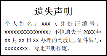 個人姓名:XXX(身份證編號:XXXXXXXXXXXXXXX)不慎遺失于20XX年XX月XX日XX辦理的駕駛證,證件編號:XXXXXXXX,特此聲明作廢。