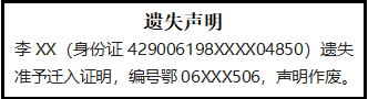 李XX(身份證429006198XXXX04850)遺失準(zhǔn)予遷入證明,編號鄂06XXX506,聲明作廢。
