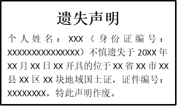 個人姓名:XXX(身份證編號:XXXXXXXXXXXXXXX)不慎遺失于20XX年XX月XX日XX開具的位于XX省XX市XX縣XX區(qū)XX塊地域國土證,證件編號:XXXXXXXX,特此聲明作廢。