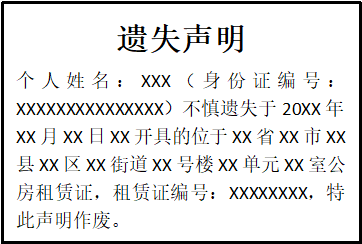 個人姓名:XXX(身份證編號:XXXXXXXXXXXXXXX)不慎遺失于20XX年XX月XX日XX開具的位于XX省XX市XX縣XX區(qū)XX街道XX號樓XX單元XX室公房租賃證,租賃證編號:XXXXXXXX,特此聲明作廢。