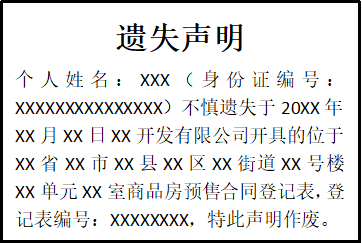 個人姓名:XXX(身份證編號:XXXXXXXXXXXXXXX)不慎遺失于20XX年XX月XX日XX開發(fā)有限公司開具的位于XX省XX市XX縣XX區(qū)XX街道XX號樓XX單元XX室商品房預售合同登記表,登記表編號:XXXXXXXX,特此聲明作廢。