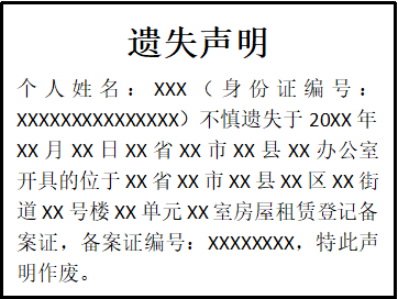 個(gè)人姓名:XXX(身份證編號(hào):XXXXXXXXXXXXXXX)不慎遺失于20XX年XX月XX日XX省XX市XX縣XX辦公室開具的位于XX省XX市XX縣XX區(qū)XX街道XX號(hào)樓XX單元XX室房屋租賃登記備案證,備案證編號(hào):XXXXXXXX,特此聲明作廢。