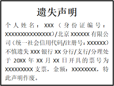 個(gè)人姓名:XXX(身份證編號(hào):XXXXXXXXXXXXXXX)/北京XXXXXX有限公司(統(tǒng)一社會(huì)信用代碼/注冊(cè)號(hào):XXXXXX)不慎遺失XXX銀行XX分行/支行/分理處于20XX年XX月XX日開具的票號(hào)為XXXXXXXXX支票,金額:XXXXXXXX,特此聲明作廢。