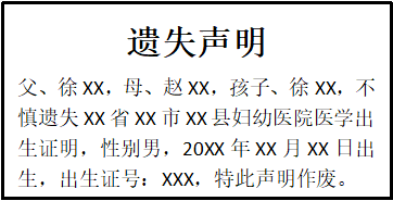 父、徐XX,母、趙XX,孩子、徐XX,不慎遺失XX省XX市XX縣婦幼醫(yī)院醫(yī)學(xué)出生證明,性別男,20XX年XX月XX日出生,出生證號(hào):XXX,特此聲明作廢。