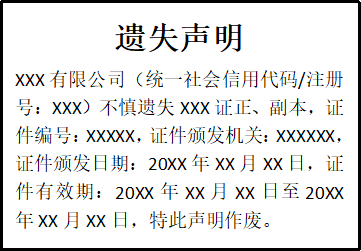 XXX有限公司(統(tǒng)一社會信用代碼/注冊號:XXX)不慎遺失XXX證正、副本,證件編號:XXXXX,證件頒發(fā)機關(guān):XXXXXX,證件頒發(fā)日期:20XX年XX月XX日,證件有效期:20XX年XX月XX日至20XX年XX月XX日,特此聲明作廢。