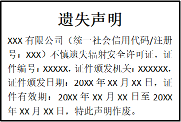 XXX有限公司(統(tǒng)一社會(huì)信用代碼/注冊(cè)號(hào):XXX)不慎遺失輻射安全許可證,證件編號(hào):XXXXX,證件頒發(fā)機(jī)關(guān):XXXXXX,證件頒發(fā)日期:20XX年XX月XX日,證件有效期:20XX年XX月XX日至20XX年XX月XX日,特此聲明作廢。