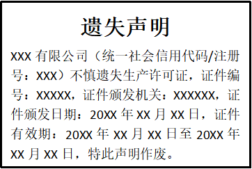 XXX有限公司(統(tǒng)一社會信用代碼/注冊號:XXX)不慎遺失生產許可證,證件編號:XXXXX,證件頒發(fā)機關:XXXXXX,證件頒發(fā)日期:20XX年XX月XX日,證件有效期:20XX年XX月XX日至20XX年XX月XX日,特此聲明作廢。