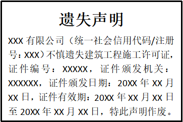 XXX有限公司(統(tǒng)一社會(huì)信用代碼/注冊(cè)號(hào):XXX)不慎遺失建筑工程施工許可證,證件編號(hào):XXXXX,證件頒發(fā)機(jī)關(guān):XXXXXX,證件頒發(fā)日期:20XX年XX月XX日,證件有效期:20XX年XX月XX日至20XX年XX月XX日,特此聲明作廢。