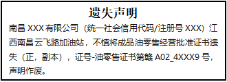 南昌XXX有限公司(統(tǒng)一社會(huì)信用代碼/注冊(cè)號(hào)XXX)江西南昌云飛路加油站,不慎將成品油零售經(jīng)營(yíng)批準(zhǔn)證書(shū)遺失(正,副本),證號(hào)-油零售證書(shū)第贛A02_4XXX9號(hào),聲明作廢。