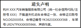 杭州XXX汽車銷售服務(wù)有限公司(統(tǒng)一社會信用代碼/注冊號XXX)不慎遺失機動車合格證一張,合格證印刷號NO.D02XXX54,合格證編號YK36233XXXX568 ,車架號LRDV7PXXXX005966,聲明作廢。