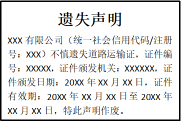 XXX有限公司(統(tǒng)一社會信用代碼/注冊號:XXX)不慎遺失道路運輸證,證件編號:XXXXX,證件頒發(fā)機關(guān):XXXXXX,證件頒發(fā)日期:20XX年XX月XX日,證件有效期:20XX年XX月XX日至20XX年XX月XX日,特此聲明作廢。