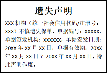 XXX機(jī)構(gòu)(統(tǒng)一社會(huì)信用代碼/注冊(cè)號(hào):XXX)不慎遺失保單,單據(jù)編號(hào):XXXXX,單據(jù)簽發(fā)機(jī)構(gòu):XXXXXX,單據(jù)簽發(fā)日期:20XX年XX月XX日,單據(jù)有效期:20XX年XX月XX日至20XX年XX月XX日,特此聲明作廢。