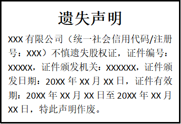 XXX有限公司(統(tǒng)一社會信用代碼/注冊號:XXX)不慎遺失股權(quán)證,證件編號:XXXXX,證件頒發(fā)機(jī)關(guān):XXXXXX,證件頒發(fā)日期:20XX年XX月XX日,證件有效期:20XX年XX月XX日至20XX年XX月XX日,特此聲明作廢。