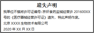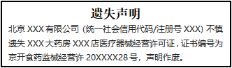 北京XXX有限公司(統(tǒng)一社會(huì)信用代碼/注冊(cè)號(hào)XXX)不慎遺失XXX大藥房XXX店醫(yī)療器械經(jīng)營(yíng)許可證,證書(shū)編號(hào)為京開(kāi)食藥監(jiān)械經(jīng)營(yíng)許20XXXX28號(hào),聲明作廢。