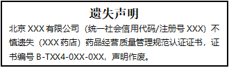 北京XXX有限公司(統(tǒng)一社會信用代碼/注冊號XXX)不慎遺失(XXX藥店)藥品經(jīng)營質(zhì)量管理規(guī)范認(rèn)證證書,證書編號B-TXX4-0XX-0XX,聲明作廢。