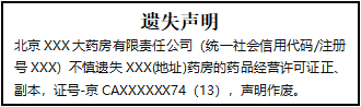 北京XXX大藥房有限責任公司(統(tǒng)一社會信用代碼/注冊號XXX)不慎遺失XXX(地址)藥房的藥品經(jīng)營許可證正、副本,證號-京CAXXXXXX74(13),聲明作廢。