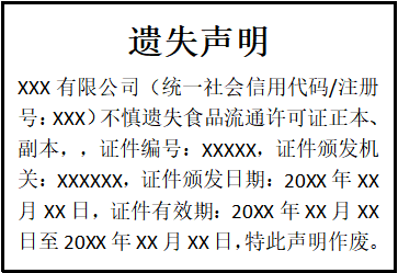 XXX有限公司(統(tǒng)一社會(huì)信用代碼/注冊號(hào):XXX)不慎遺失食品流通許可證正本、副本,證件編號(hào):XXXXX,證件頒發(fā)機(jī)關(guān):XXXXXX,證件頒發(fā)日期:20XX年XX月XX日,證件有效期:20XX年XX月XX日至20XX年XX月XX日,特此聲明作廢。